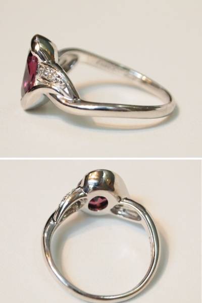ガーネットの両サイドに天然ダイヤもセットされたプラチナ900製の枠はスリムでシンプルなシルエット。美しい曲線で邪魔にならないデザインだと思います。スリムなフォルムですが作りもしっかりしていて重量感もあります。