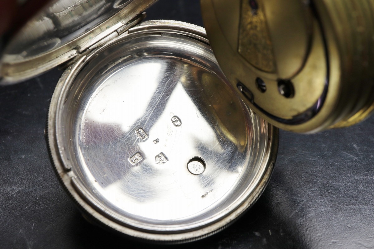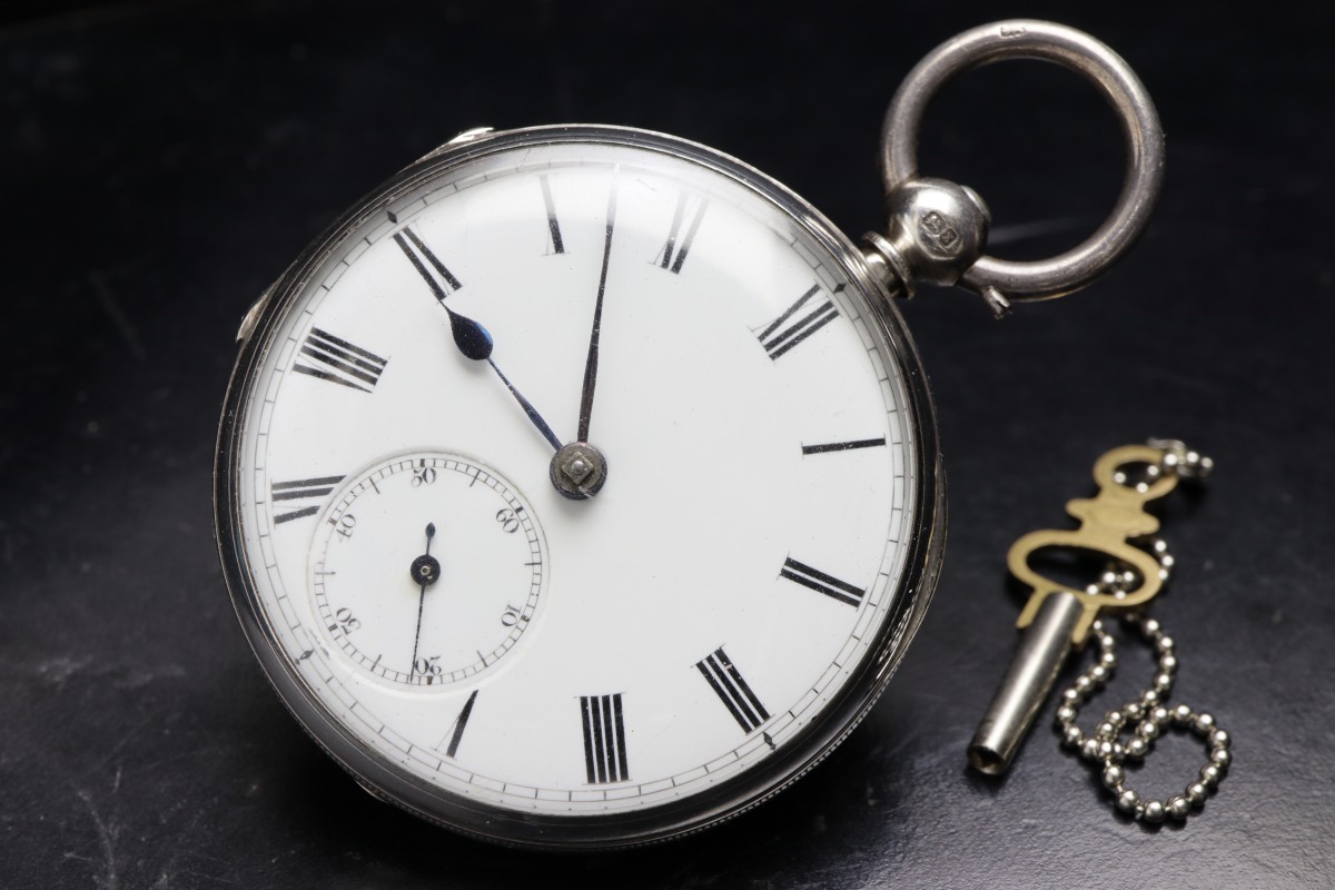 John FlecknerのJFの刻印がある、英国製の銀無垢の鍵巻き懐中時計です。
