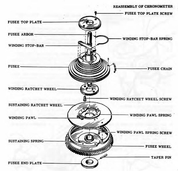 輪軸の原理によりゼンマイのトルク変動曲線を直線にならし、時計の歩度変動を小さくする効果があり、マリンクロノメーター等の高精度機に搭載される複雑機構です。