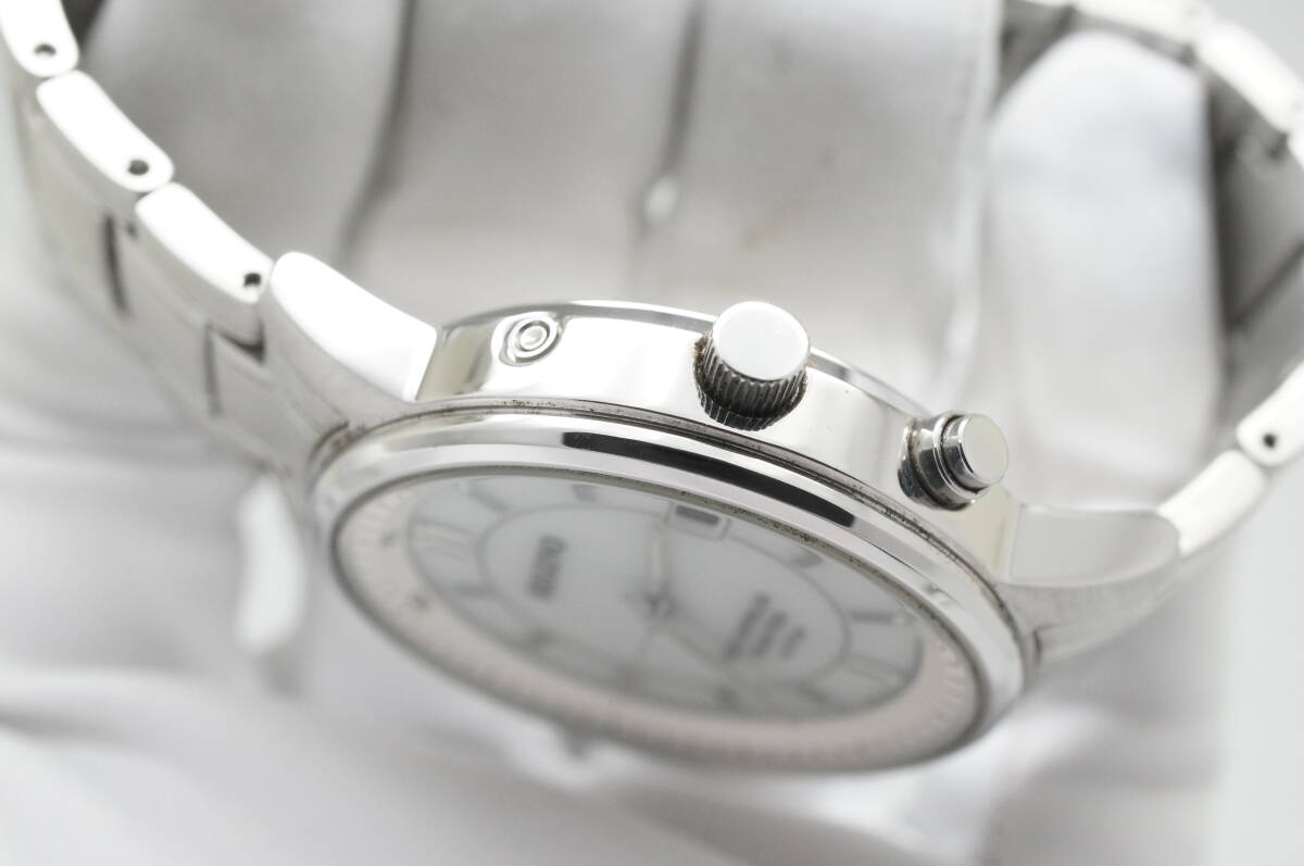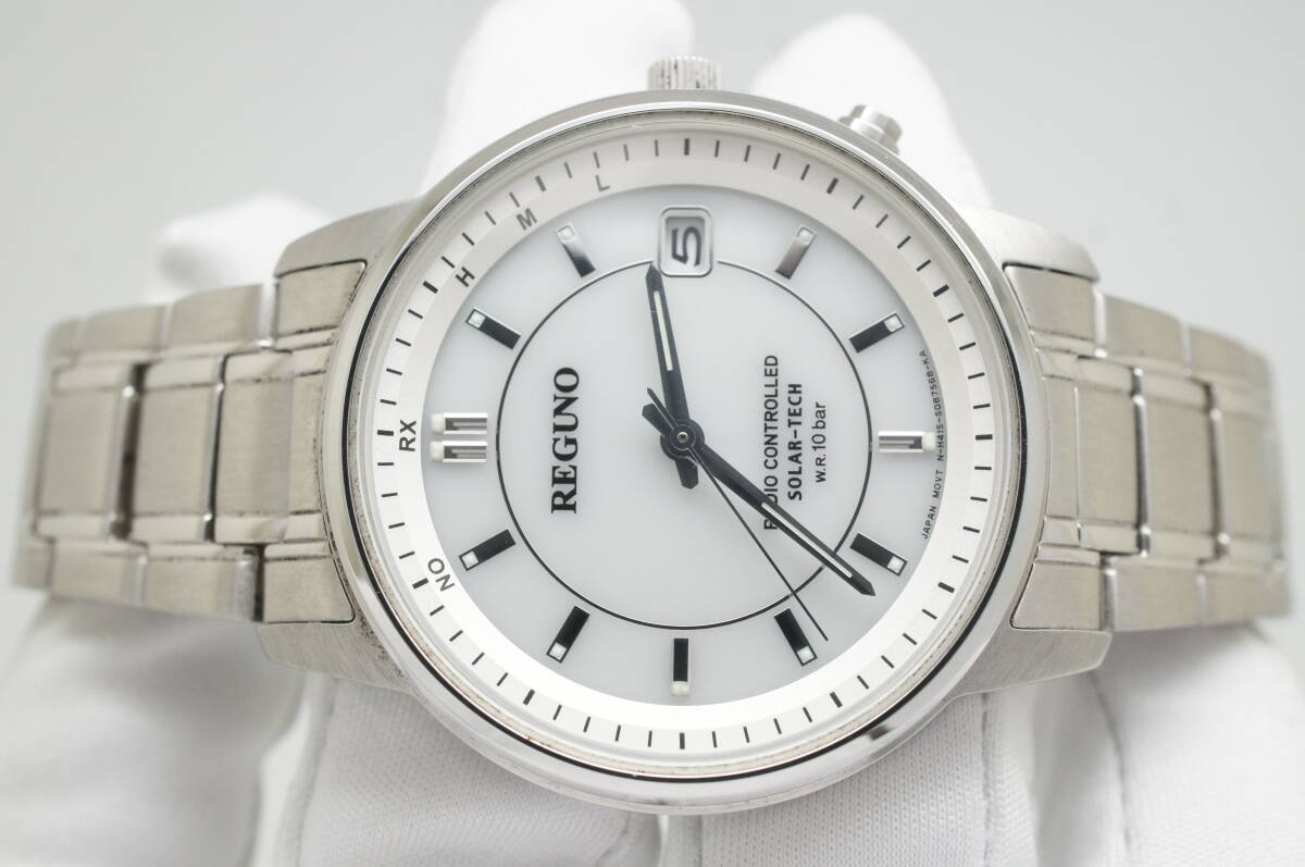 W39●作動良好 美品 CITIZEN シチズン REGUNO レグノ 電波ソーラー H415-S057523 白文字盤 デイト メンズ腕時計 シルバー お洒落 クォーツ