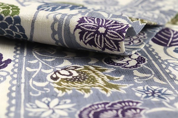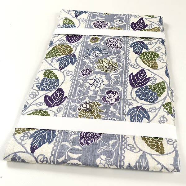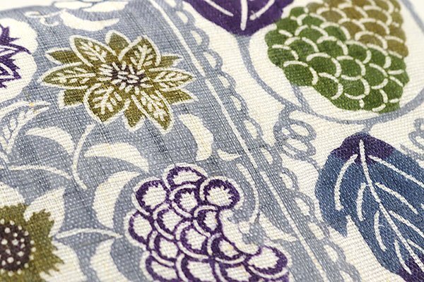 「昼夜ぶどう更紗」と題された、ざっくりとした風合いが独特の本麻の帯地は、灰みの青紫色のお色目でございます。