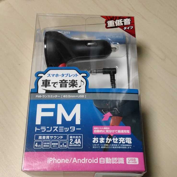 スマホ・タブレットを充電しながら車で音楽を楽しめる。 重低音モード搭載、φ3.5mmミニプラグ接続タイプのFMトランスミッター。