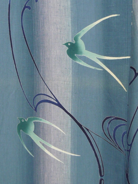 渋い青緑~暈し~紫みの灰~などの経て縞のグラデーションに燕の模様の注染浴衣です。バチ衿です。表は衿線にわずかに着用の跡が見られます。(あまり目立ちませんが)表地で背中心から3,5cmの背当て・肩当てが付けられています。素材木綿です。ミシンと手縫いの仕立てです。(背縫いに少しミシン目が切れている為手縫いが加えられ手います)