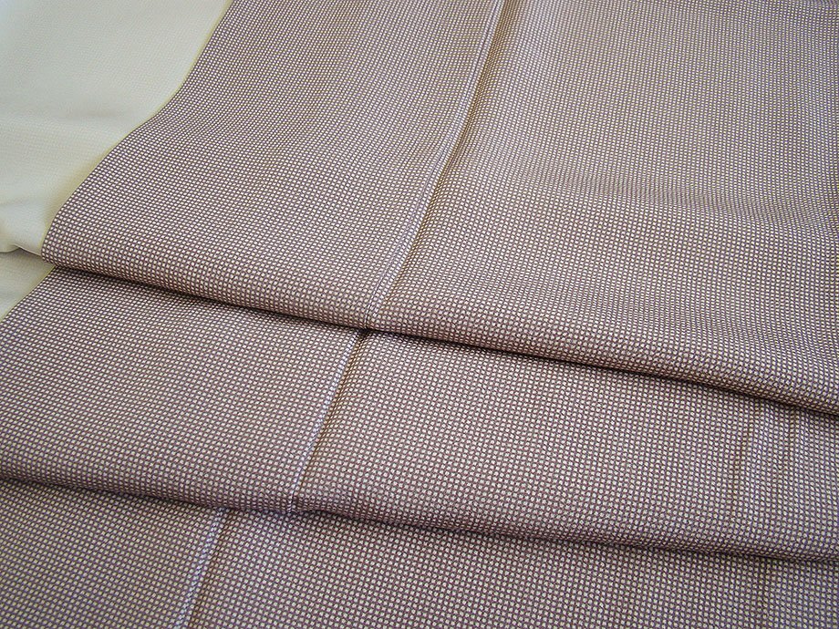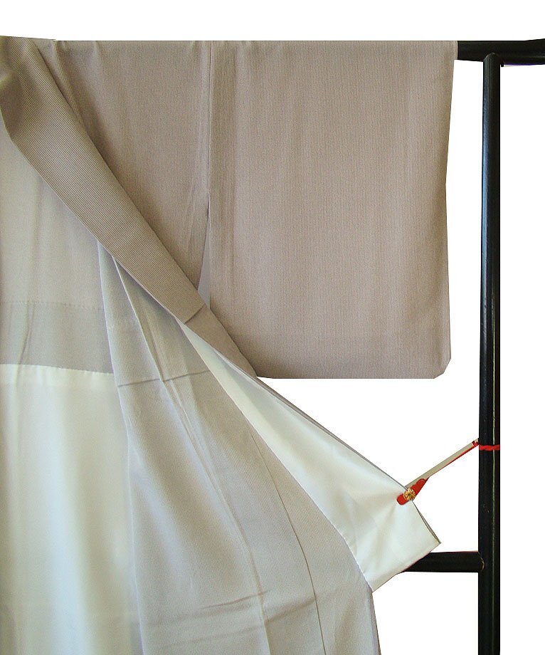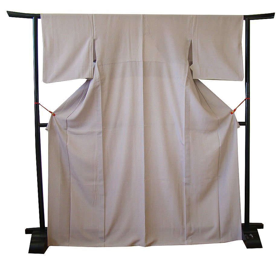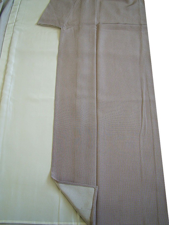淡い鳩羽鼠色地に白の角通し柄の染柄。  正絹の居敷当て2巾付。  手縫い仕立。