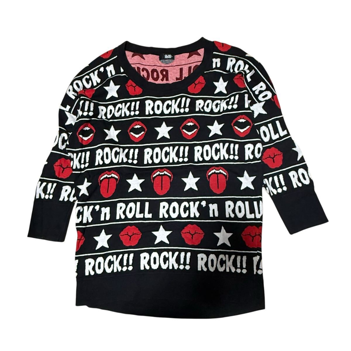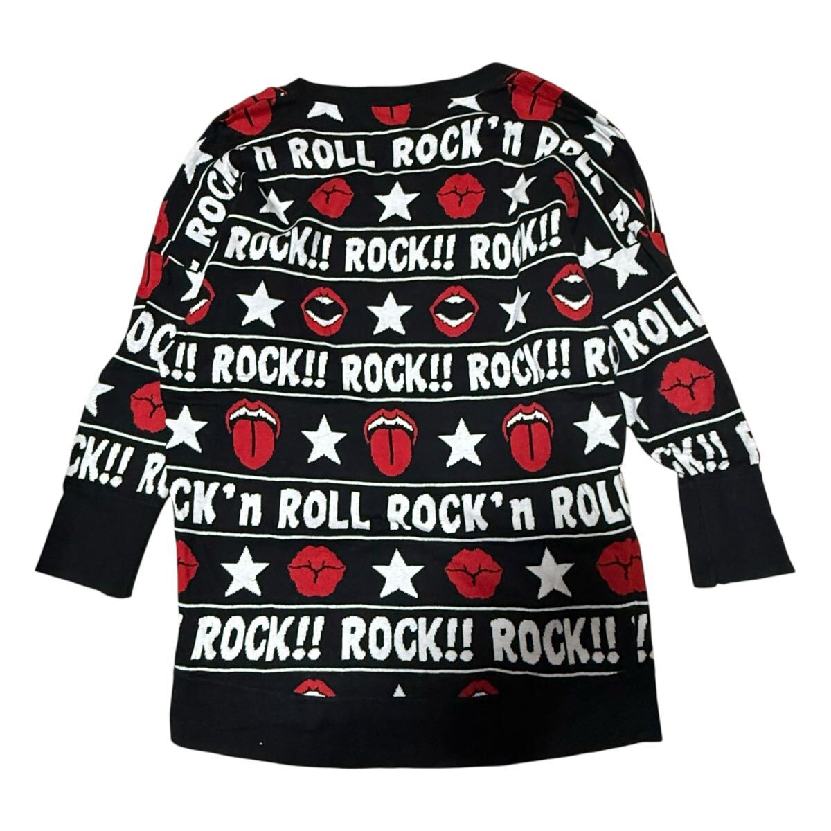大胆な「ROCK!!」ロゴと星、唇モチーフが全面にデザインされたインパクト抜群のニットセーターです。ブラック×レッドのカラーリングが存在感を放ち、ロックテイストのコーデや個性派スタイルにぴったり。1枚で主役になるトップスです。