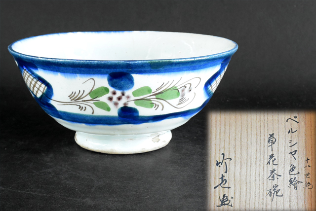 茶道具 竹世(古賀健蔵)書付 十八世紀ペルシャ色絵 草花 茶碗