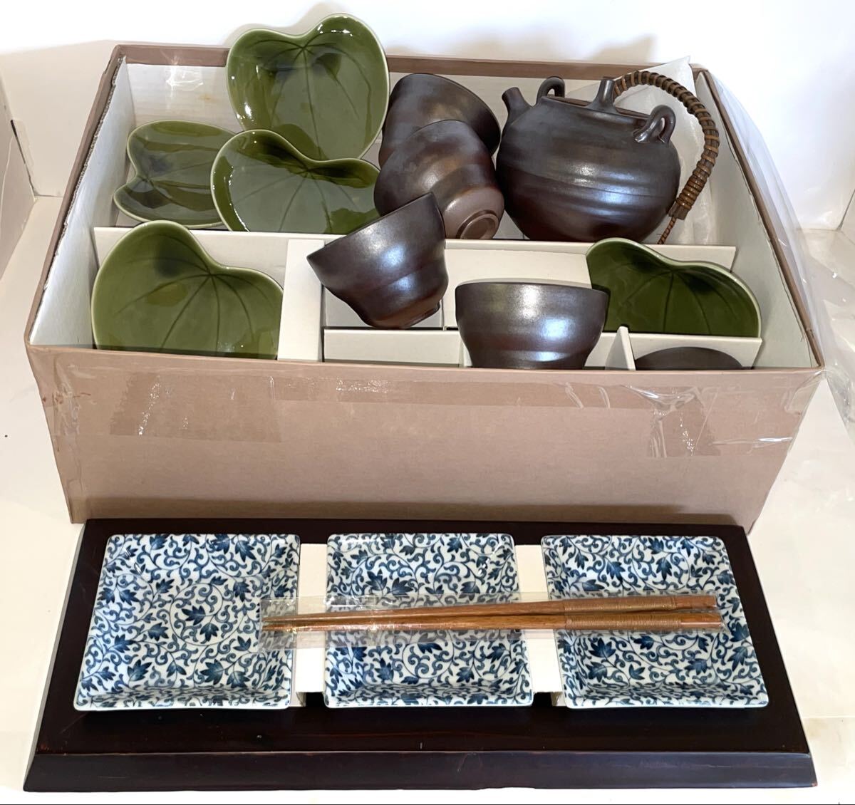 Product name: 和◆栄楽窯◆ 湯のみX5/急須/葉っぱ型小皿 銘々皿X5/角皿盛り皿X3/漆器台 茶器 湯飲み 5客揃え 陶器 未使用