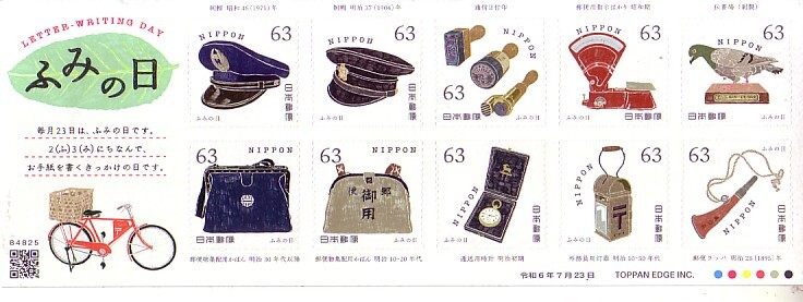 「ふみの日 Letter Writing Day 令和6年」の記念切手です (63円切手X10枚)。送料は普通便110円(郵送 複数落札でも同一料金)になります。