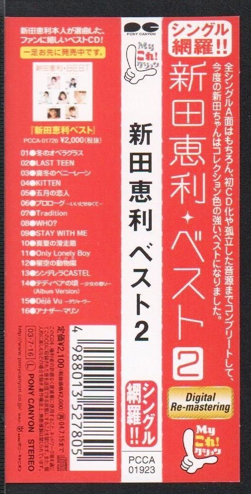 ■新田恵利■「BEST 2(ベスト)」■Myこれ!クション■♪不思議な手品のように♪■リマスター■PCCA-01923■2003/7/16発売■帯付き■美品■