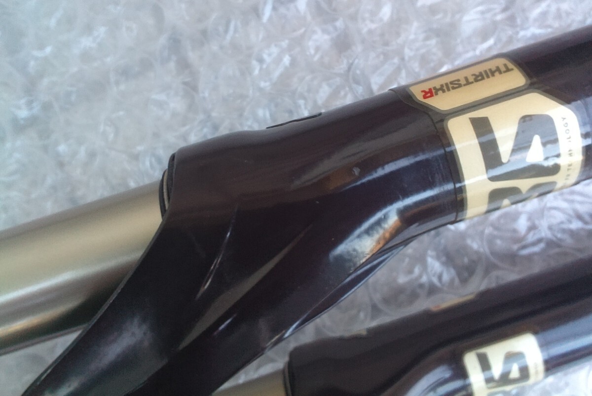 アウターレッグとクラウンにスレキズ塗装剥げがあります、ステッカーに黄ばみがあります