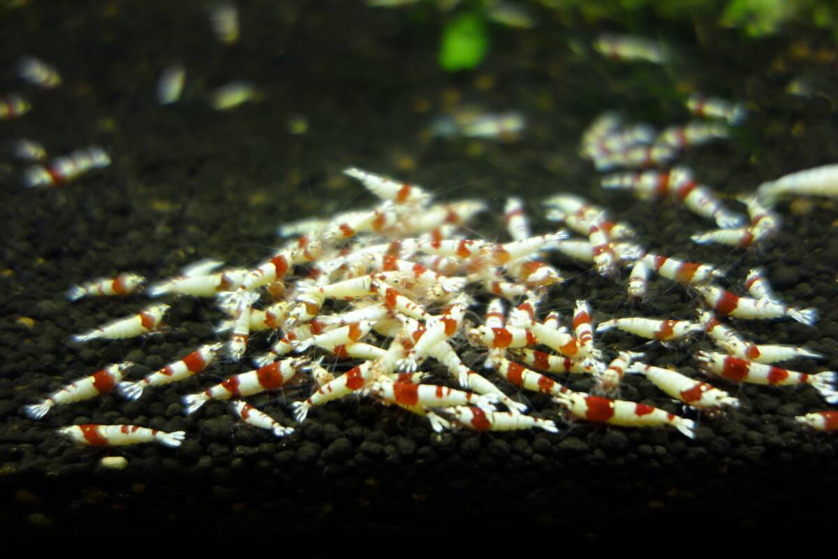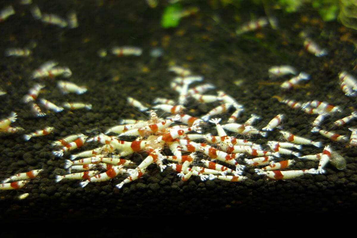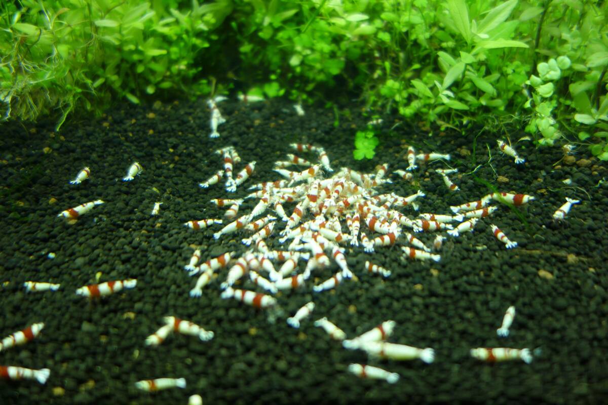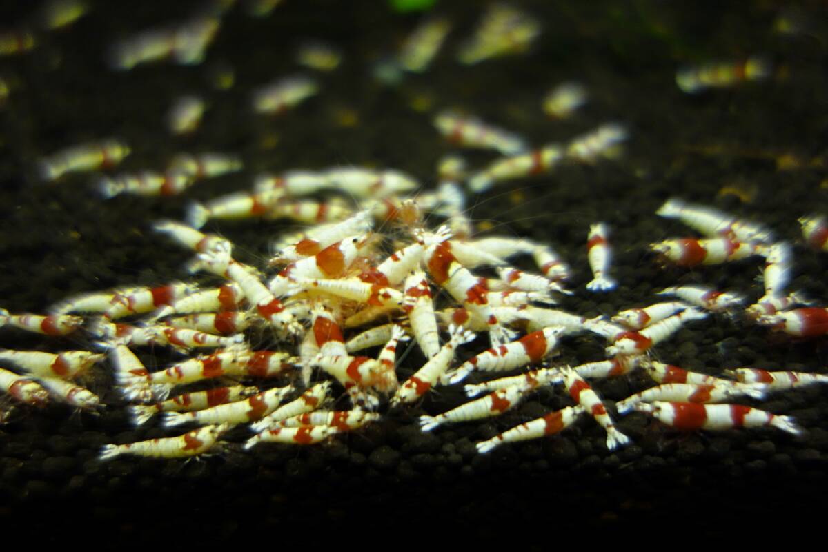 画像のような水槽から、若いエビをいろいろな柄が入るように雌雄無選別ですくいます。