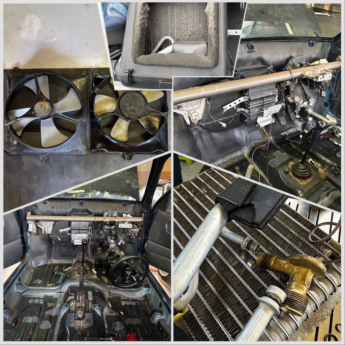 エアコンは、コンデンサー(リビルト品に交換)レシーバードライヤー新品、エバポレーターを取り外し清掃、Oリング交換。