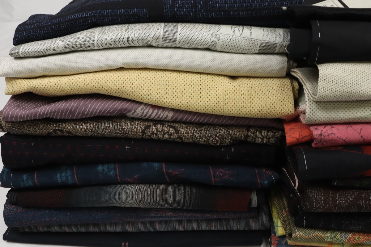 アンサンブルは1セットで2枚のカウントになります。麻なども含まれます。交織のものもあるかと思いますが、ほとんどが正絹になります。