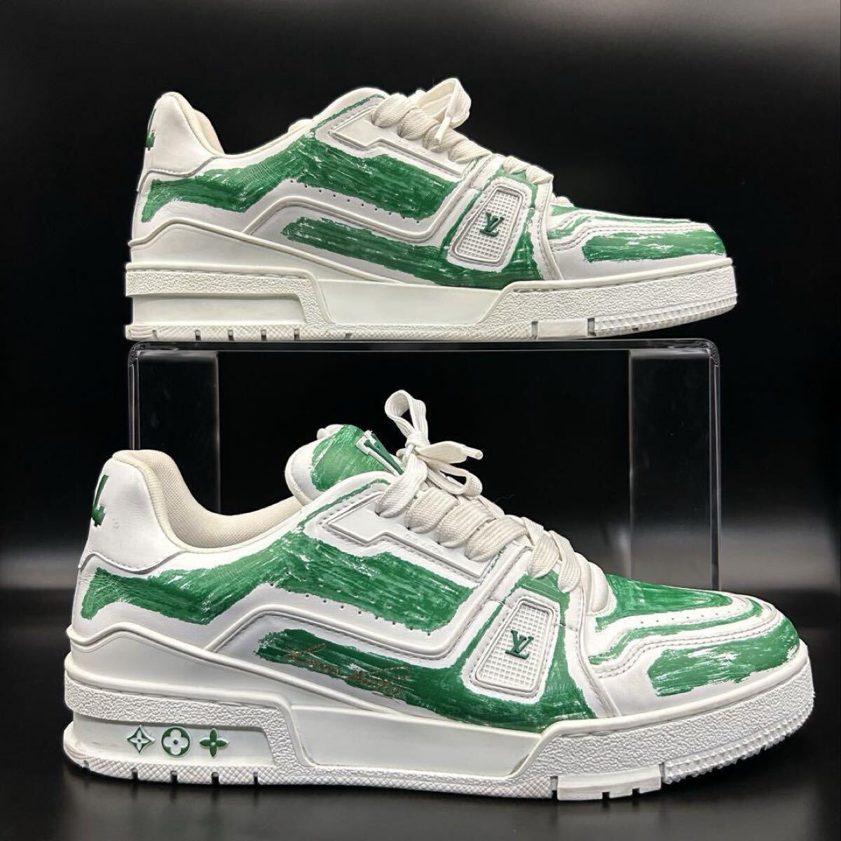 1円【極美品】LOUIS VUITTON ルイヴィトン LV トレイナー ライン スニーカー ローカット LVロゴ メンズ レザー グリーン ホワイト 緑 白