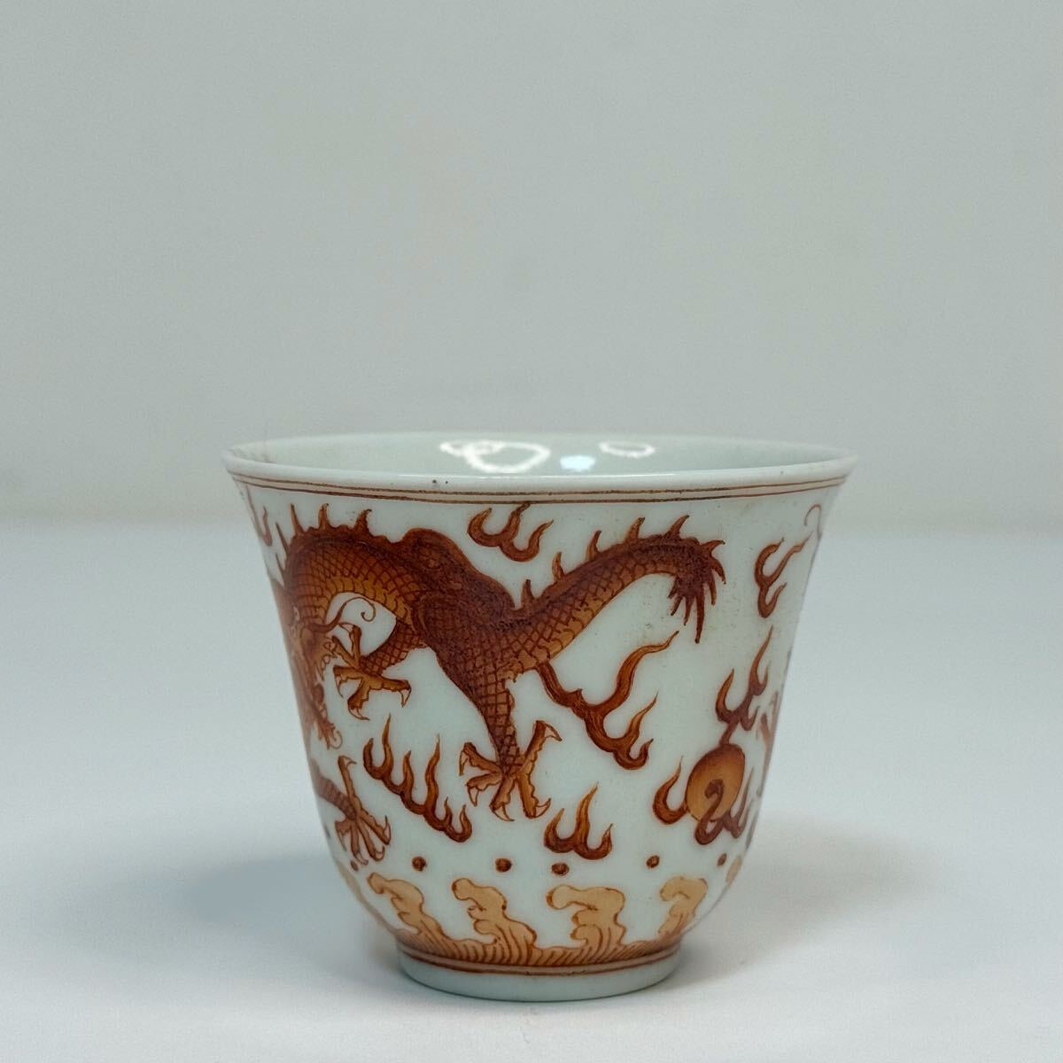 X-中国古美術 時代物 色絵 茶碗 盃 杯 礬紅 龍図 在銘 大清光緒年製 共箱付 唐物 陶磁器 中国古玩 骨董品 幅5.8cm 高さ4.9cm