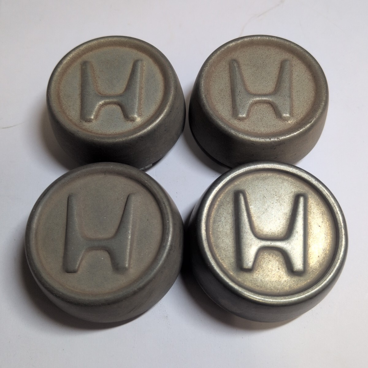 ホンダ純正センターキャップ4個セットです。 底辺の直径約5.9センチです。 頂点の直径約4.9センチです。 取り付け部分直径約5.5センチです。 高さは取り付け部分入れないで約2.2センチです。軽く雑巾で拭いた程度です。 全体的汚れ等有ります。 取り付け部分はしっかりしているので塗装、メッキ等レストアベースでお考え下さい。 中古品の為神経質な方はご遠慮下さい。 写真で判断頂きノークレームノーリターンでお願い致します。 送料一律600円です。(レターパックプラス発送致します)