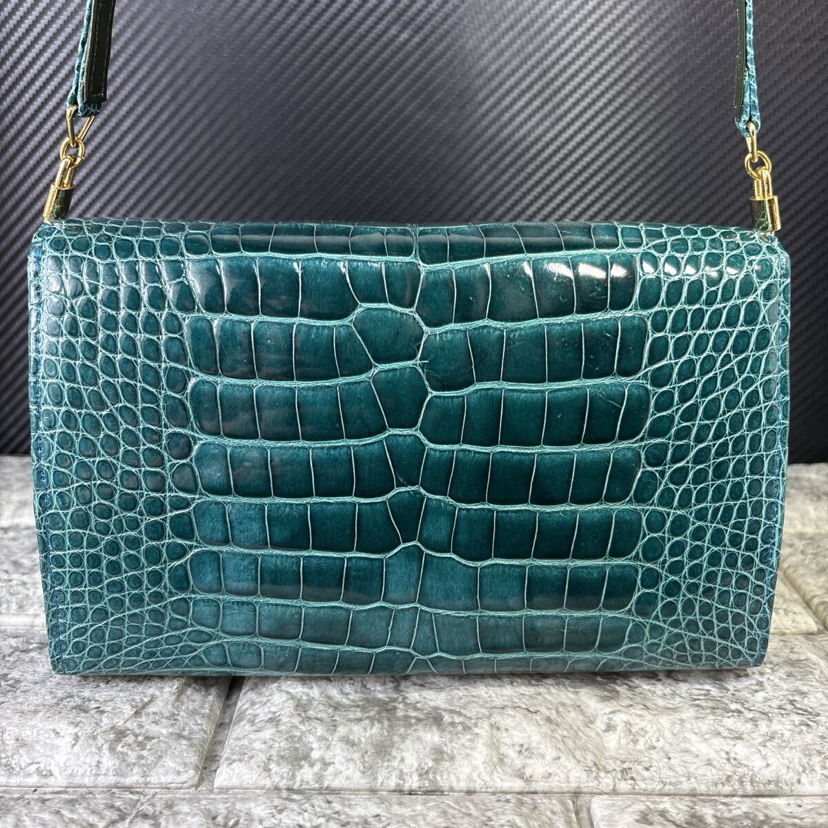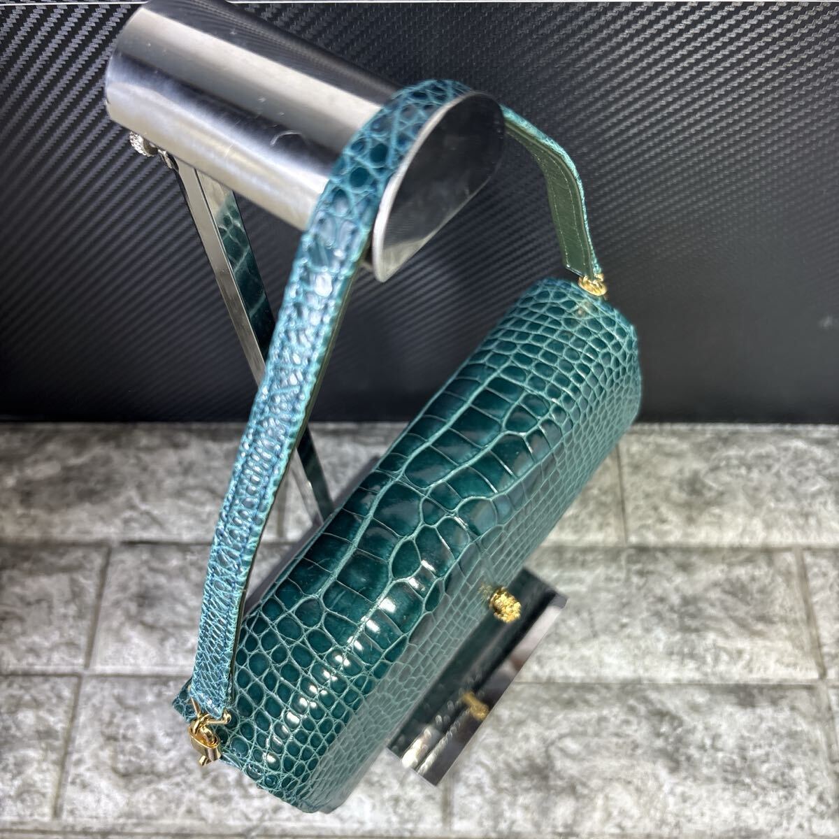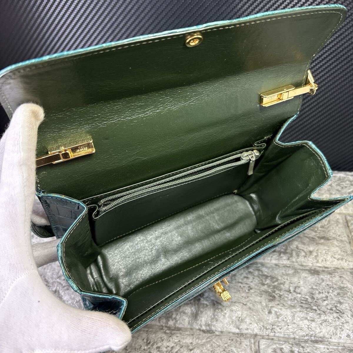 【極希少】シャイニングクロコ クロコダイル エキゾチックレザー 金具 アクセサリーポーチ ハンドバッグ グリーン 緑 ゴールド センター