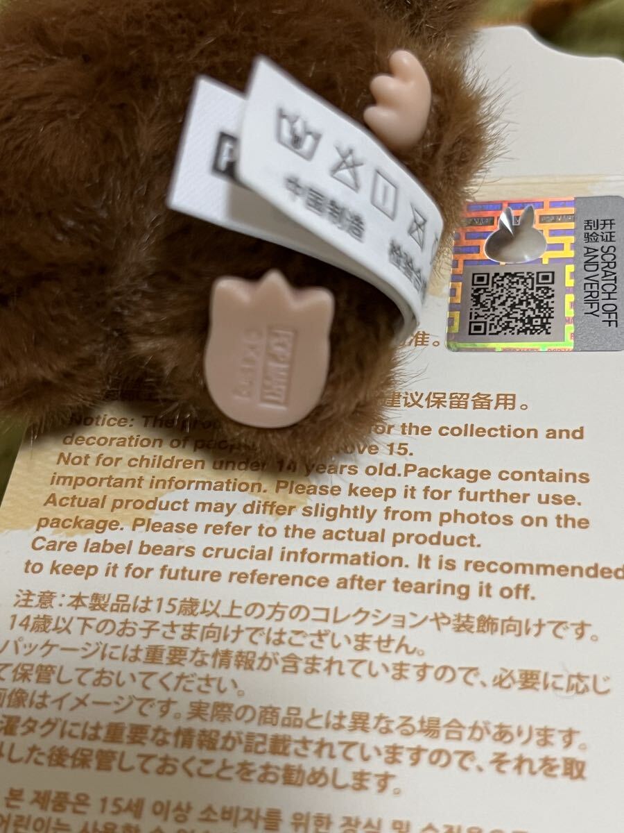 偽造防止検証の確認方法:箱にあるシールもしくはぬいぐるみの横に付いてるナイロン製のタグをスマホで読み込むと公式サイトに飛びます。