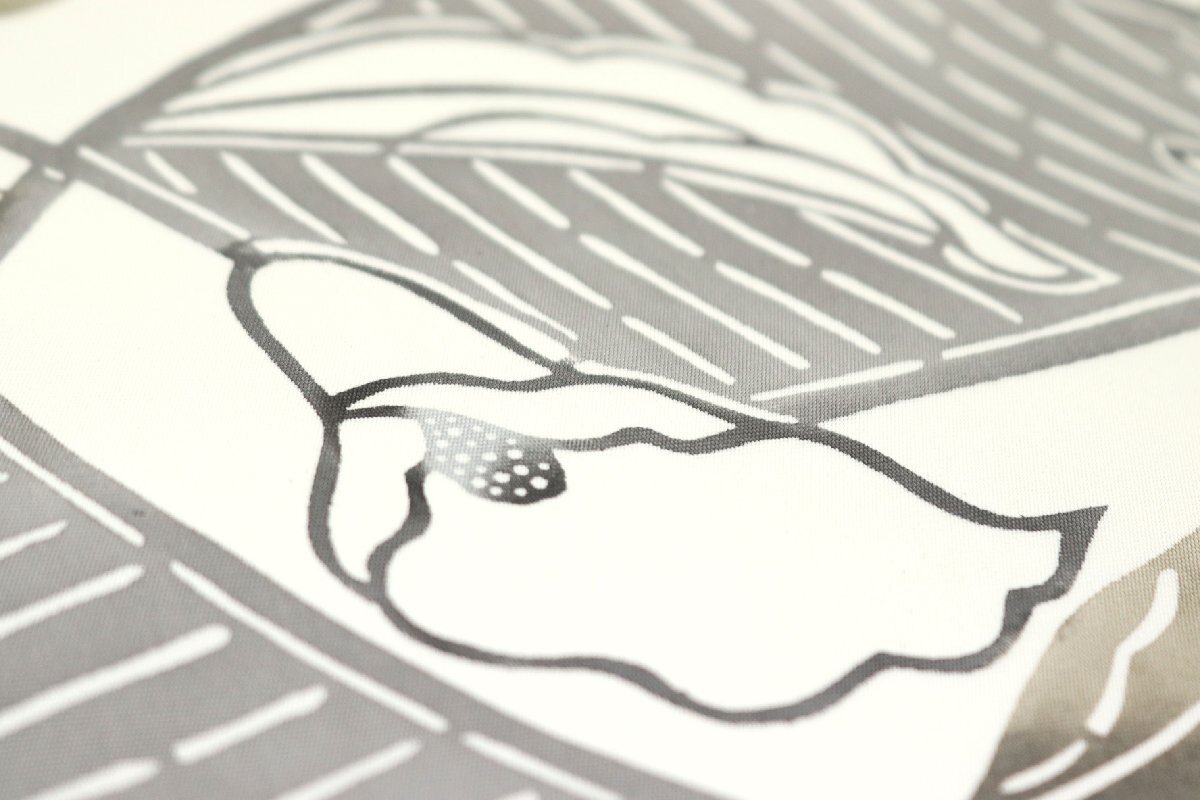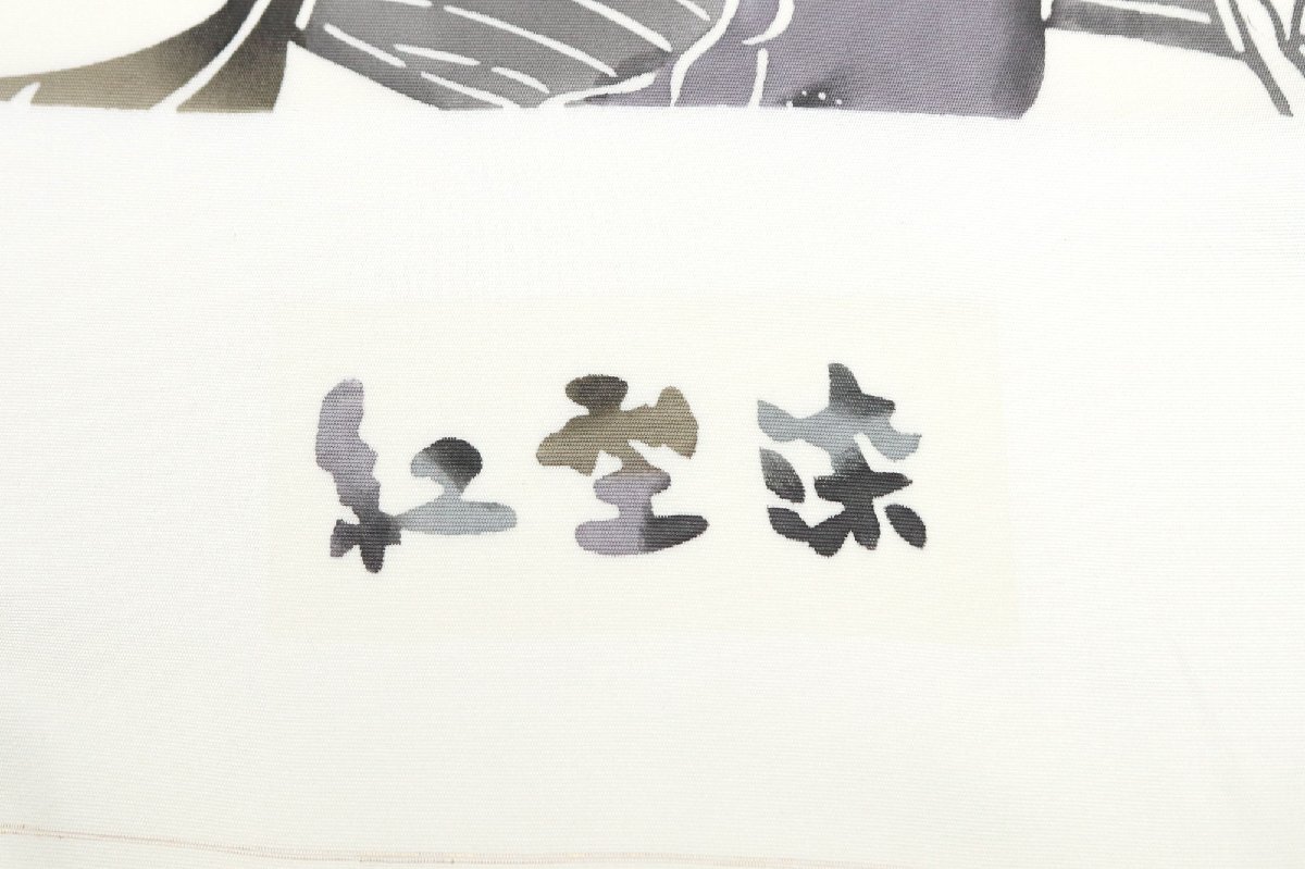 全体には墨黒色、利休茶色、グレーなどのお色目で、カラーの花が染められております。