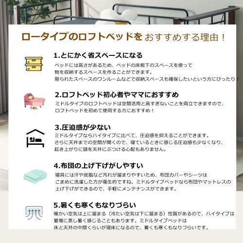 • 【130cm高さのミドルタイプ 】10cmの違いでも、開放感に違いが生じるのです。ロータイプで天井からの圧迫感がなく、毎日の昇り降りや、布団の上げ下ろしを楽にすることができます。