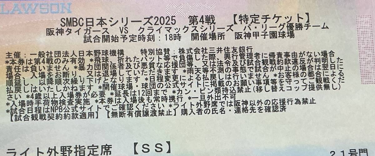 Product name: 阪神タイガース 2025 日本シリーズ  第4戦 甲子園球場ライト外野指定 1枚