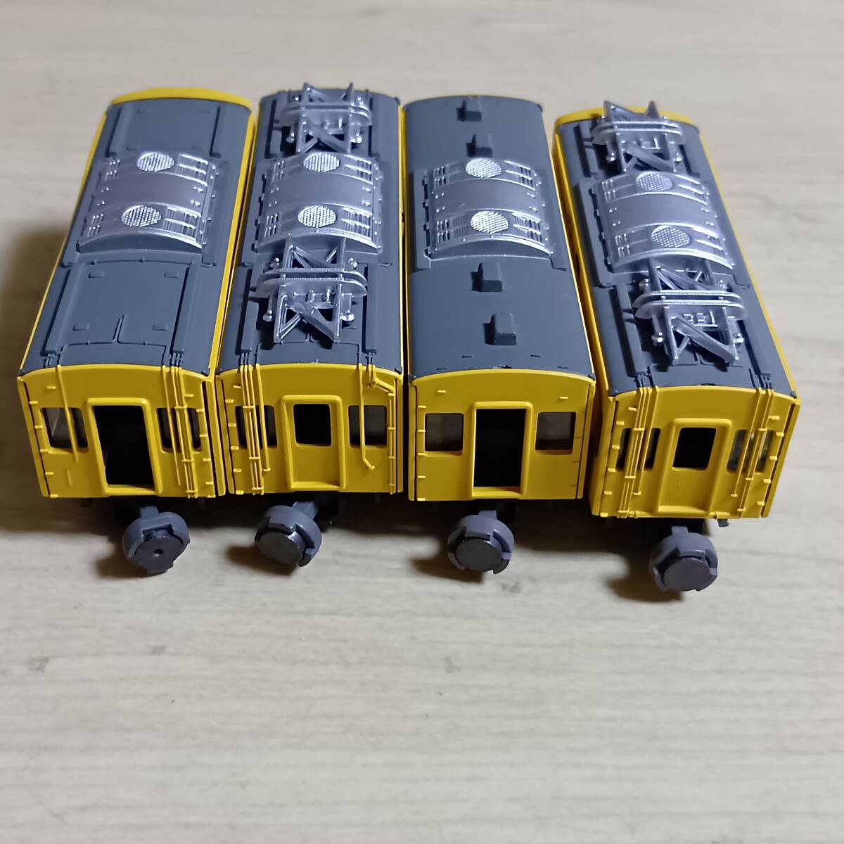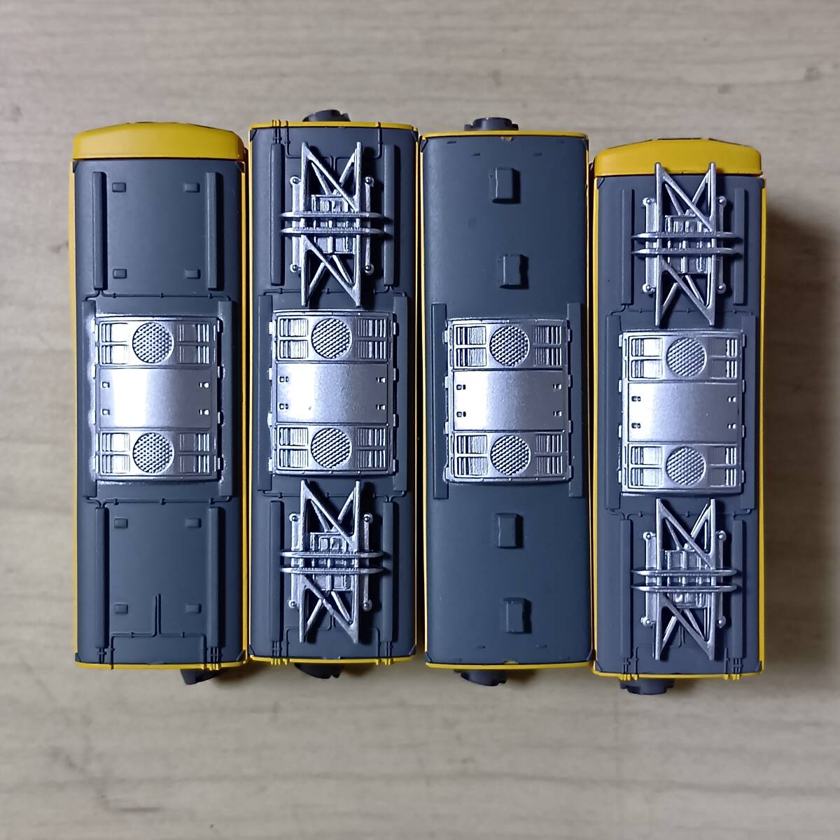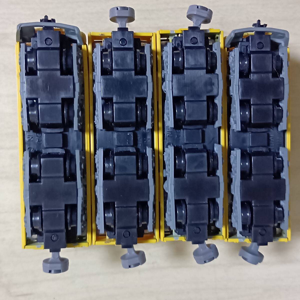 写真のもの送ります。きれいなものもあれば、塗装はげ、色付き、傷、欠品、壊れている(ボディー割れ、スカート割れ他)ものもあります。組間違いや他車部品(妻、レリーフ、パンタグラフ、スカート他)が使われている場合もあります。それらが、ついていない車両もあります。