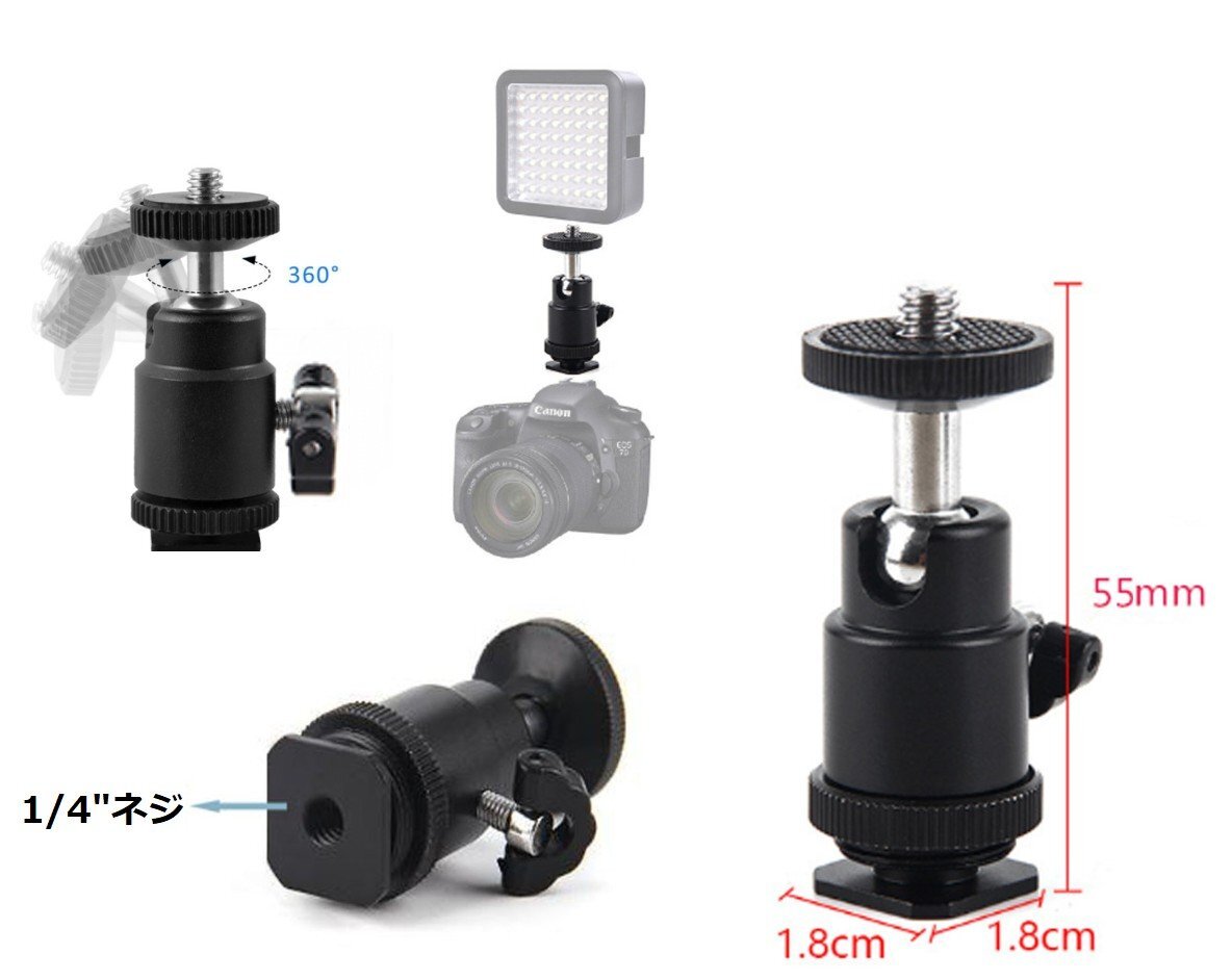 【VAPS_1】360度回転 自由雲台 1/4ネジ ホットシューアダプター付き ボールヘッド カメラ 三脚 一眼レフ 固定 送込