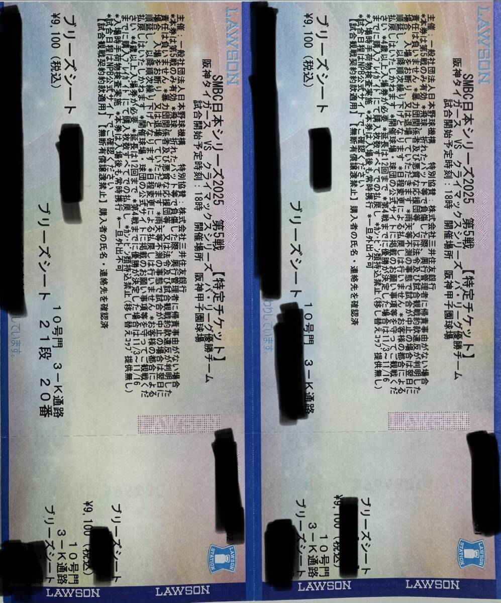 ・第5戦は10月30日(木)18時開始予定ですが、シリーズ開始後、雨天等不測の事態で試合が中止の場合は翌日に順延し、以降順次繰り下げとなりますので、日程変更による払戻しはございません。