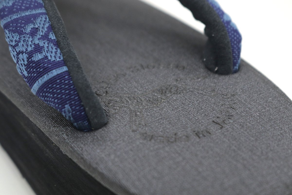 鼻緒には、紺地に青色のお色目で花模様が織り上げられた博多織の生地が使われており、黒色の裏地が付いた鼻緒がすげられております。