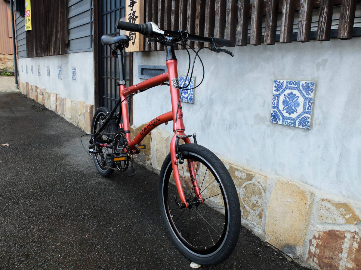 ワンタッチレバー式ではありませんが、故に折り畳みらしからぬフレーム剛性が得られ乗用してもミニベロ感覚です。