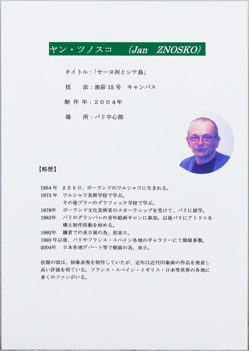ジャン・ツノスコ(Jan Znosko)は1954年2月5日、ポーランドのワルシャワに生まれ、ワルシャワ美術学校およびプラハのグラフィック学校で学んだ後、1978年にポーランド文化美術省のスカラーシップを受けてパリに留学しました。1983年にはパリのグランパレでの青年絵画サロンに参加し、以後はパリのアトリエで制作活動を展開。1992年には鎌倉での展覧会のために初来日しています。初期は抽象表現を手がけていましたが、近年は近代印象画の作品を発表し、高い評価を得ています。