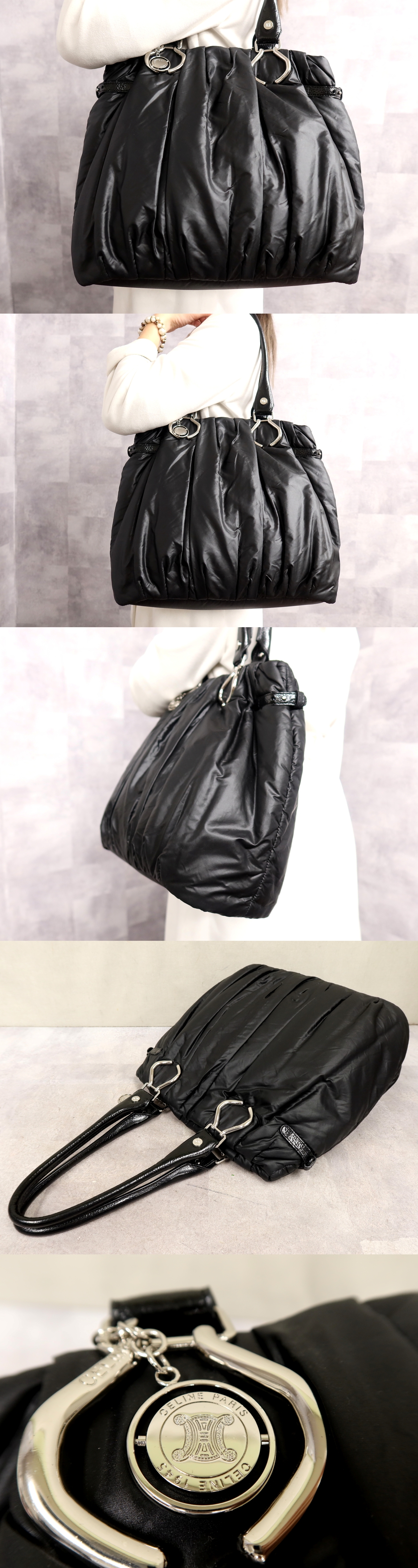 Product name: ●超美品●CELINE セリーヌ●ピロー●ナイロン エナメル パテント レザー 本革●トート バッグ●黒●シルバー金具●A4 収納 書類●Js65312