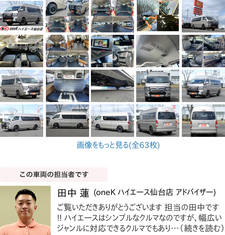 ハイエースは200系・100系・50系と経験を積んできたスタッフがご案内。 展示車両もさまざまな使い方のできる車両を並べております。 『百聞は一見に如かず』です。まずは【見て、触れて、比べて】 その上でご相談をいただくのが良いかと思います! ハイエースは趣味趣向に応じて幅広く使える車両です。決して安くはないお買い物なので専門店であるoneKにお任せください。 ご来店をお待ちしております。