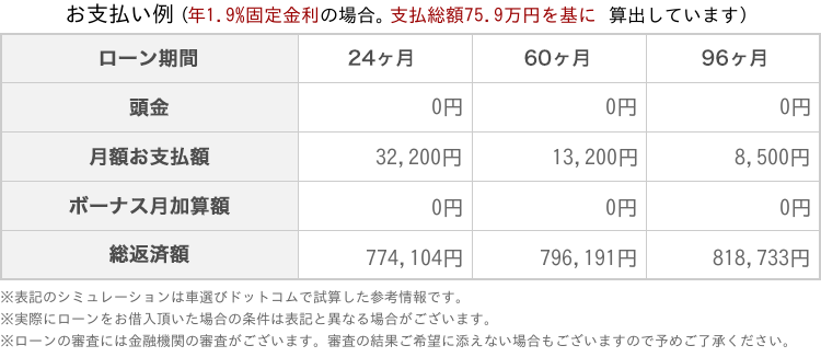 シミュレーションの計算は、オークションの開始価格と参考諸経費を合算した金額を基に算出しています。実際の購入元金とは異なる場合がございますので、予めご了承ください。