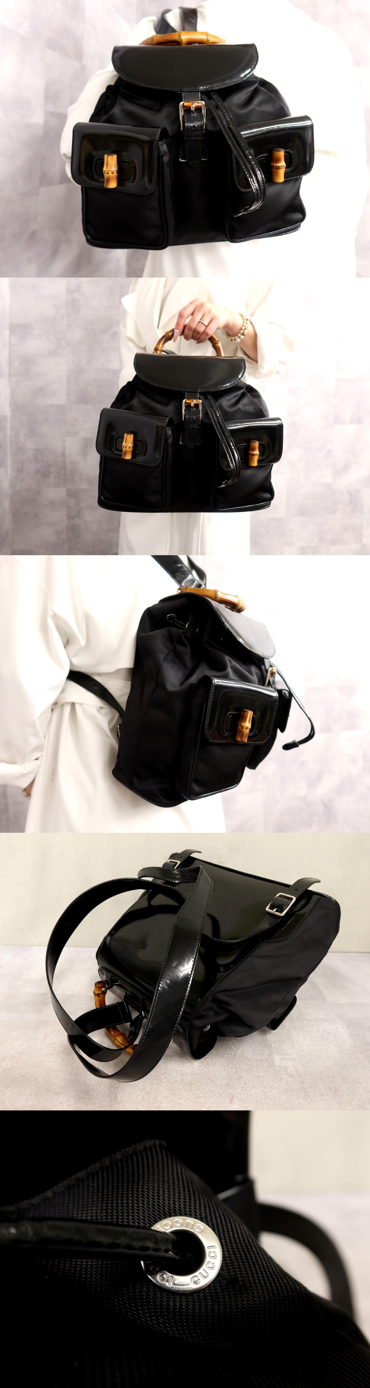 Store ●超美品●GUCCI グッチ●バンブー●エナメル パテント レザー 本革●リュックサック●黒●シルバー金具●イタリア製●B5 かばん●Js67278