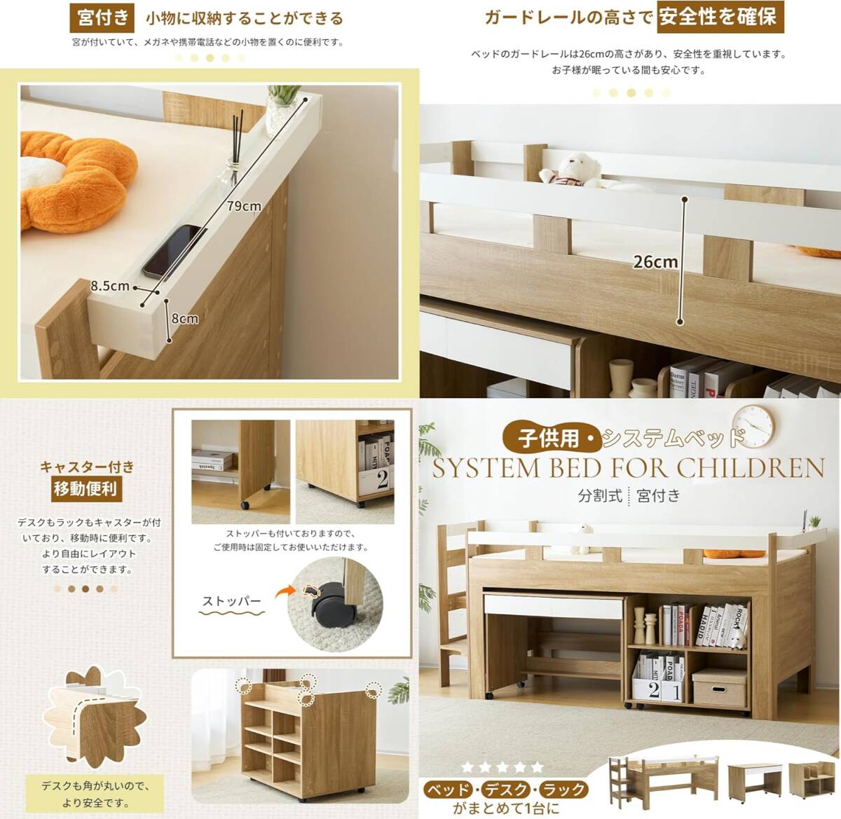 システムベッド ロフトベッド 子供用 木製 ベッドフレーム シングル コンパクト 頑丈 ロータイプ デスク付き ラック付き 本棚付き 階段 机付き分割式 天然木 シングル 宮付き 収納 北欧風 木製