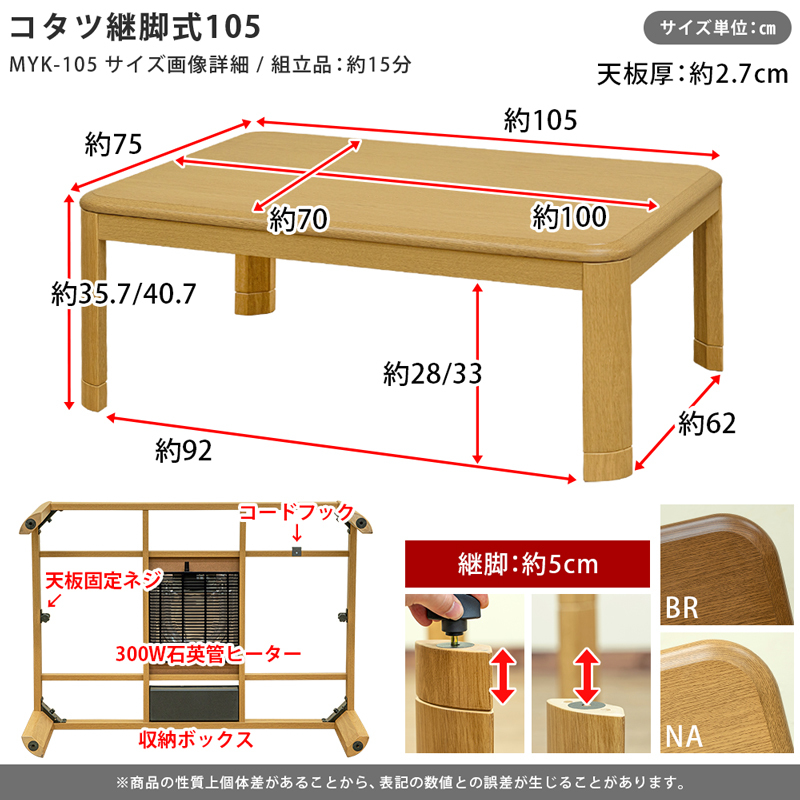 Product name: こたつテーブル105cm×75cm 継脚式 300W 中間スイッチ 家具調コタツ ホワイトウォッシュ MYK-105(WW)