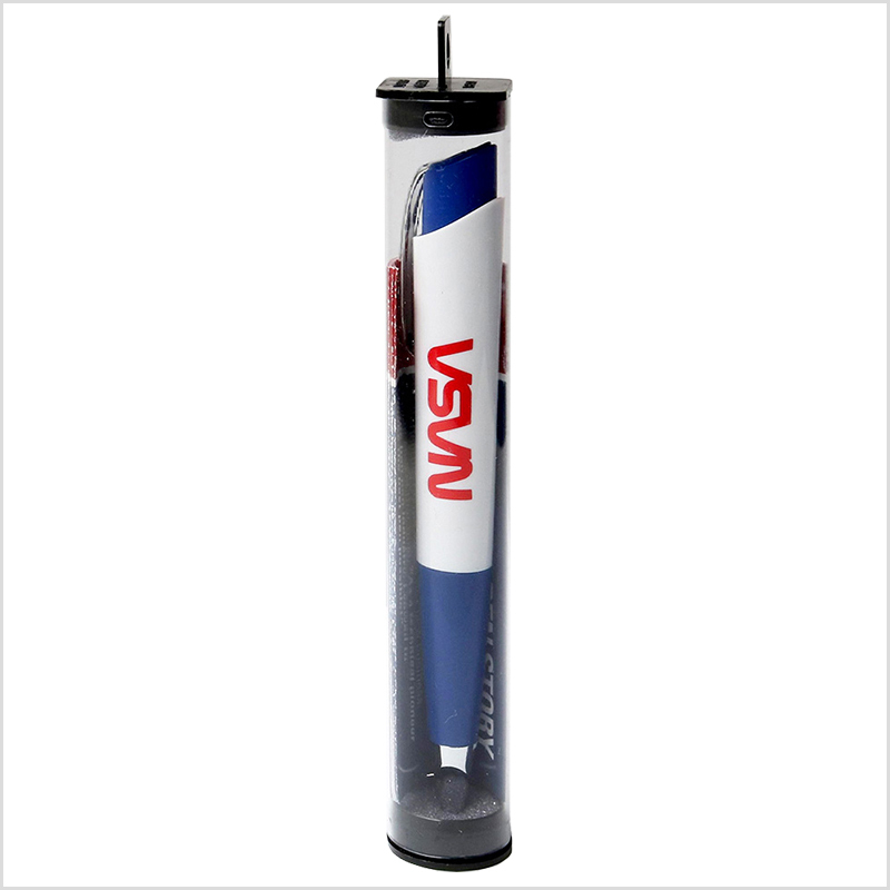 ノックがしやすい形状のトップとすっきりとしたデザインのクリップ、太めのペンでありながら緩やかな楕円形で軽量なエクリプス NASAは、持ちやすく普段使いに嬉しい1本です。より手に取りやすいプラスチックチューブのハングセル展開のパッケージ。