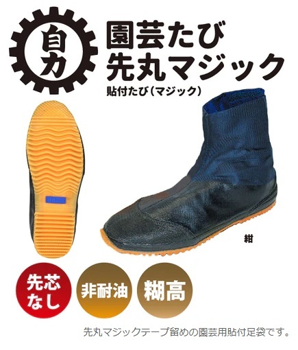 日進ゴムNISSHIN RUBBER日進ゴムの地下足袋「自力」シリーズ自力園芸たび 先丸マジック 紺品番:園芸たびサイズ:26.0cm■特長・先丸マジックテープ留めの園芸用貼付足袋です・先芯なし・非耐油・糊高