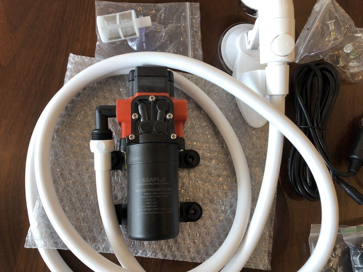 ①ポンプ 5.6L/分(防滴、圧力スイッチ付き、シャワーヘッドに付いてるスイッチON-OFFでポンプコントロール可能)