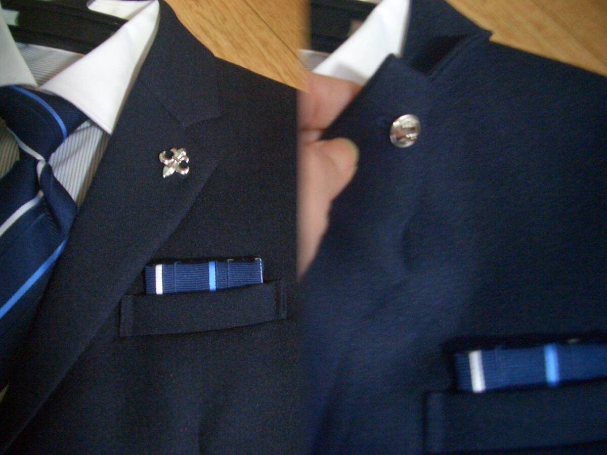 両脇ポケット有り、ポケットチーフあり、ジャケット後ろベンツスリットあり、金属の飾りピンは取り外し可能です。