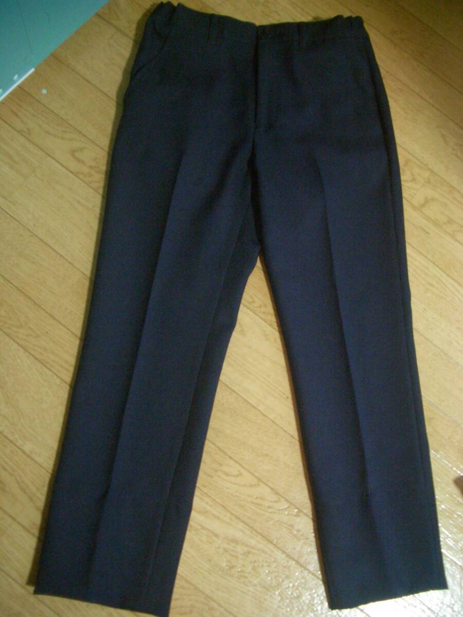 スラックス  胴囲実寸72(ウエストゴムのアジャスター付き、ボタンで調節できます) また上26 わたり55 股下62(裾上げしてまつってあります、あと10センチほどパンツ丈を伸ばせます) 総丈85