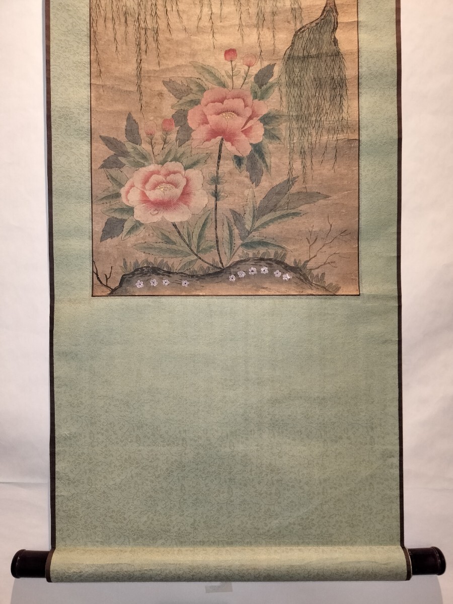 古い朝鮮書画、無落款、鳥に牡丹図、双幅、中国表装。