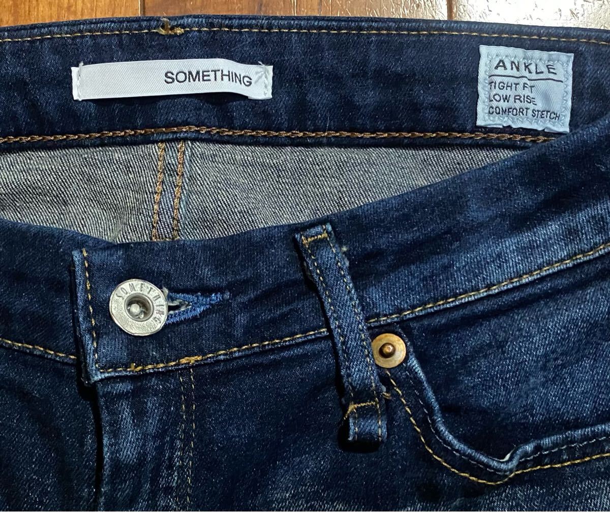 サムシングのストレッチアンクルスキニーデニム(ジーンズ)、ANKLE TIGHT FIT LOW RISE COMFORT STRETCH No.SEA06 ESV-9507 E502-2904です。色はインディゴブルーです。USEDで裾直ししておりますが状態は良いです(10段階中8程度)。ジッパーフライです。生地はストレッチ入りで綿99%、ポリウレタン1%です。正規品です((株)エドウィン、日本製)。サイズはSでウエストは重ねずに平置きで約69cm、ヒップ約84cm、股上約20cm、股下約65cm、股下15cmのふともも部分約43cm、裾まわり約29cm、重量約420gです。発送はゆうパケットポストになります。
