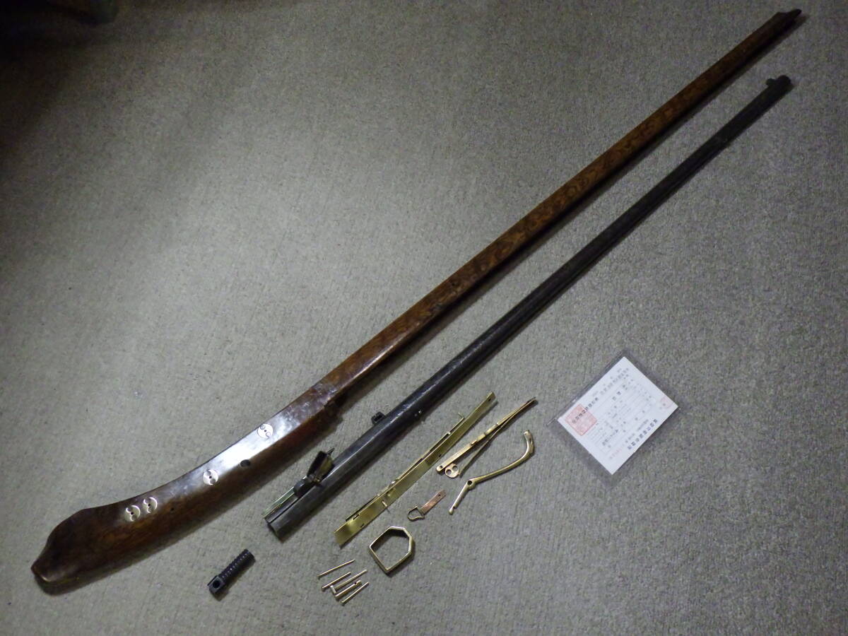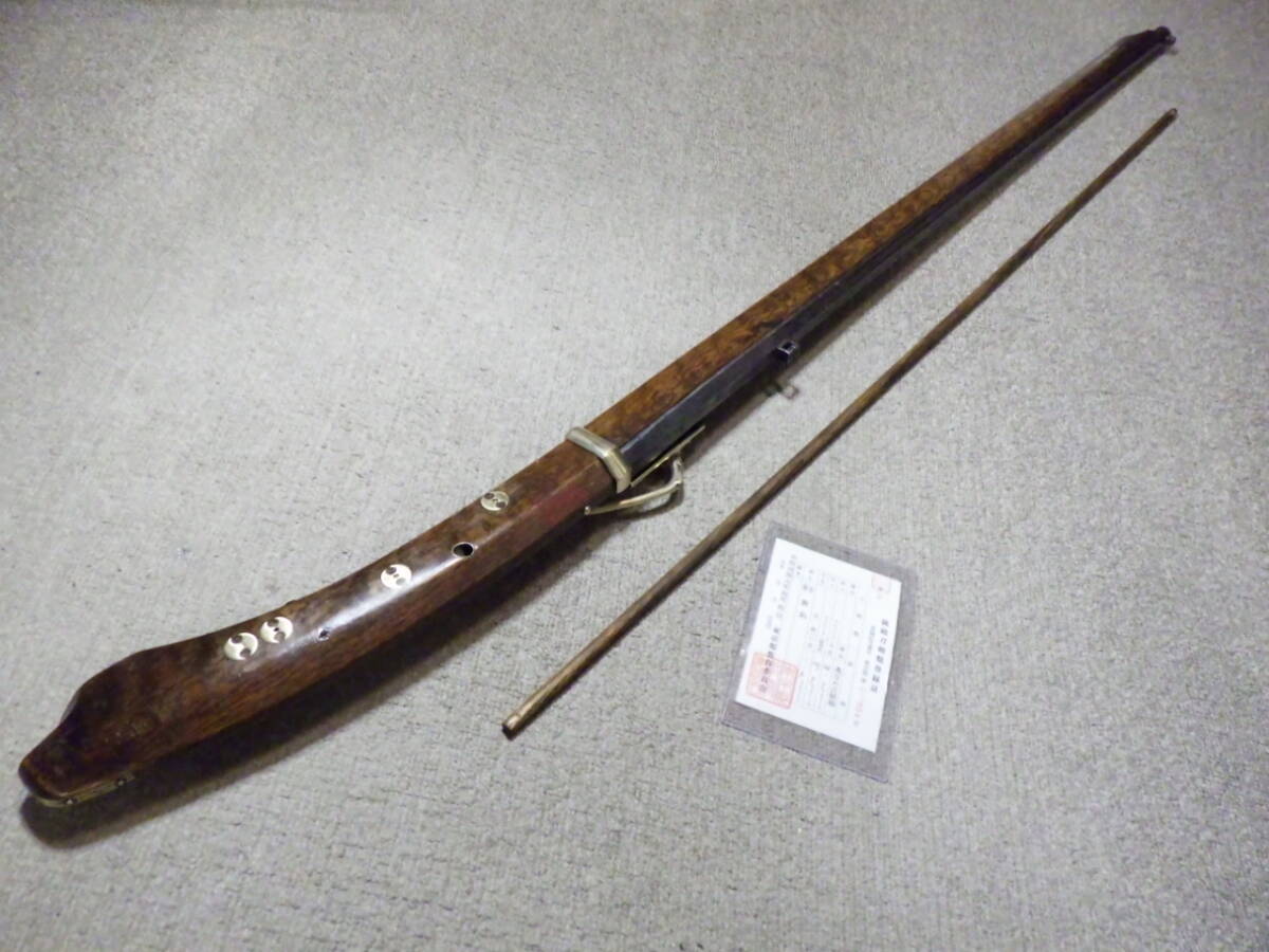 火なわ式銃砲 登録証付き(銃砲刀剣類所持等取締法第14条に基づき美術品または骨董(こっとう)品として価値があるとして都道府県の教育委員会に登録された火縄式銃砲等の古式銃)です。