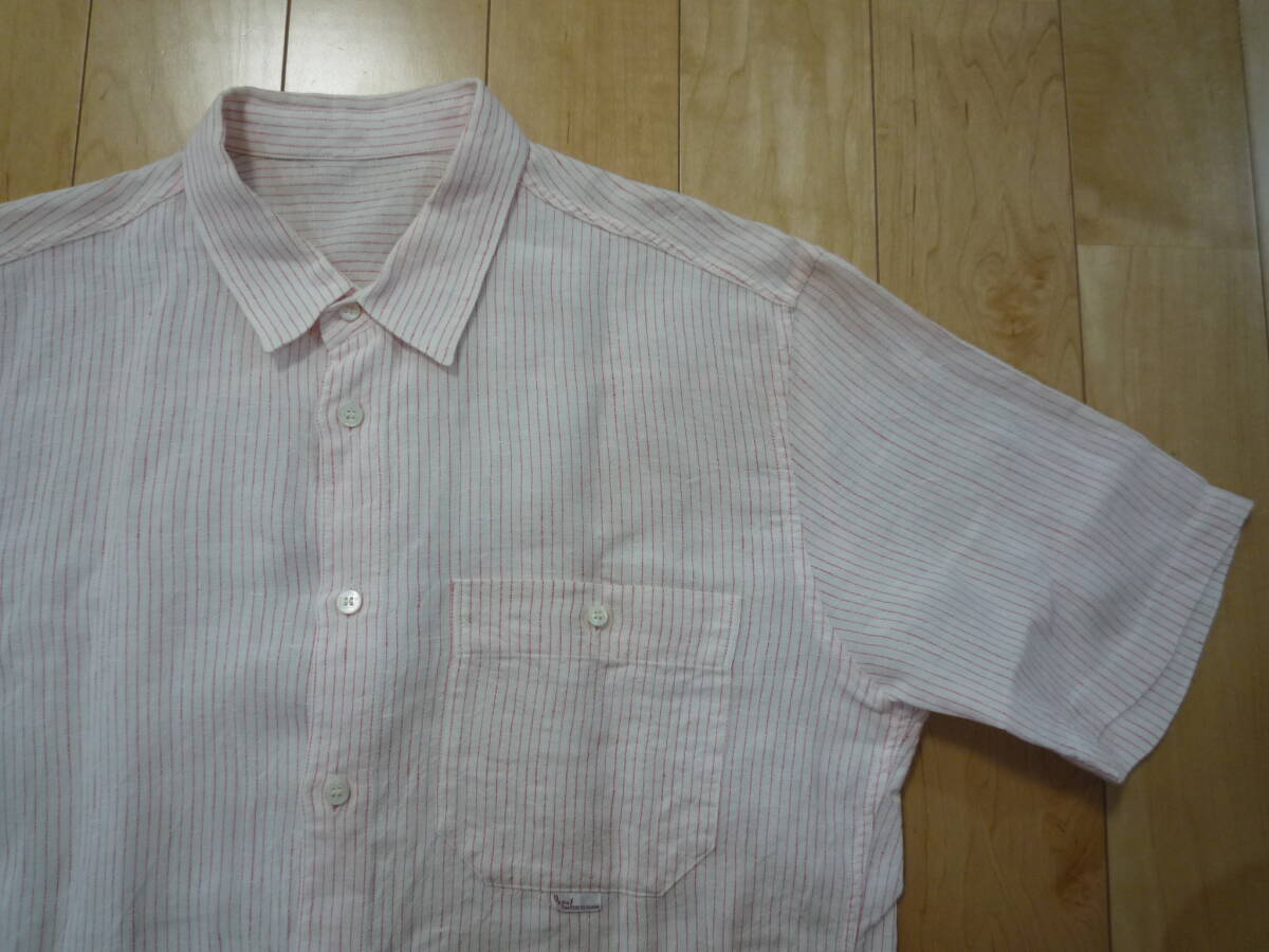 PAPAS(パパス)半袖シャツ☆麻・リネン・EMBLEM IRISH LINEN(アイリッシュ・リネン)ストライプ柄☆薄ピンク色×赤色☆M