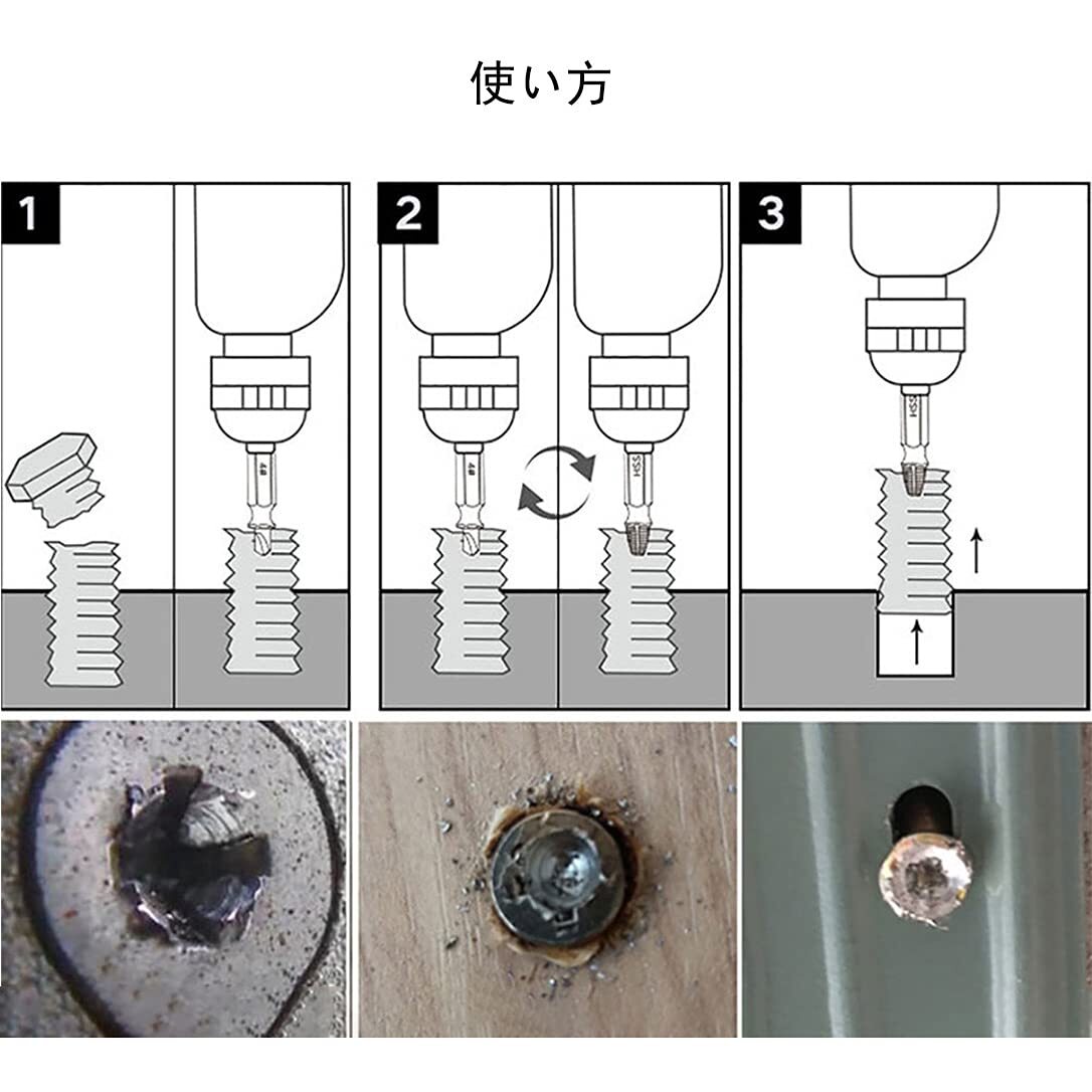 【便利】まず穴を開けてから、なめたボルトを逆回転させます。二歩だけで簡単にネジを取り外すことができます。必ず押し詰めてからゆっくりネジを出します。