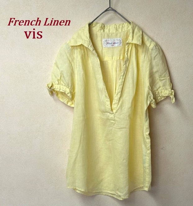 ●FrenchLinen visビスフレンチリネンプルオーバーシャツM黄●スキッパー麻100%