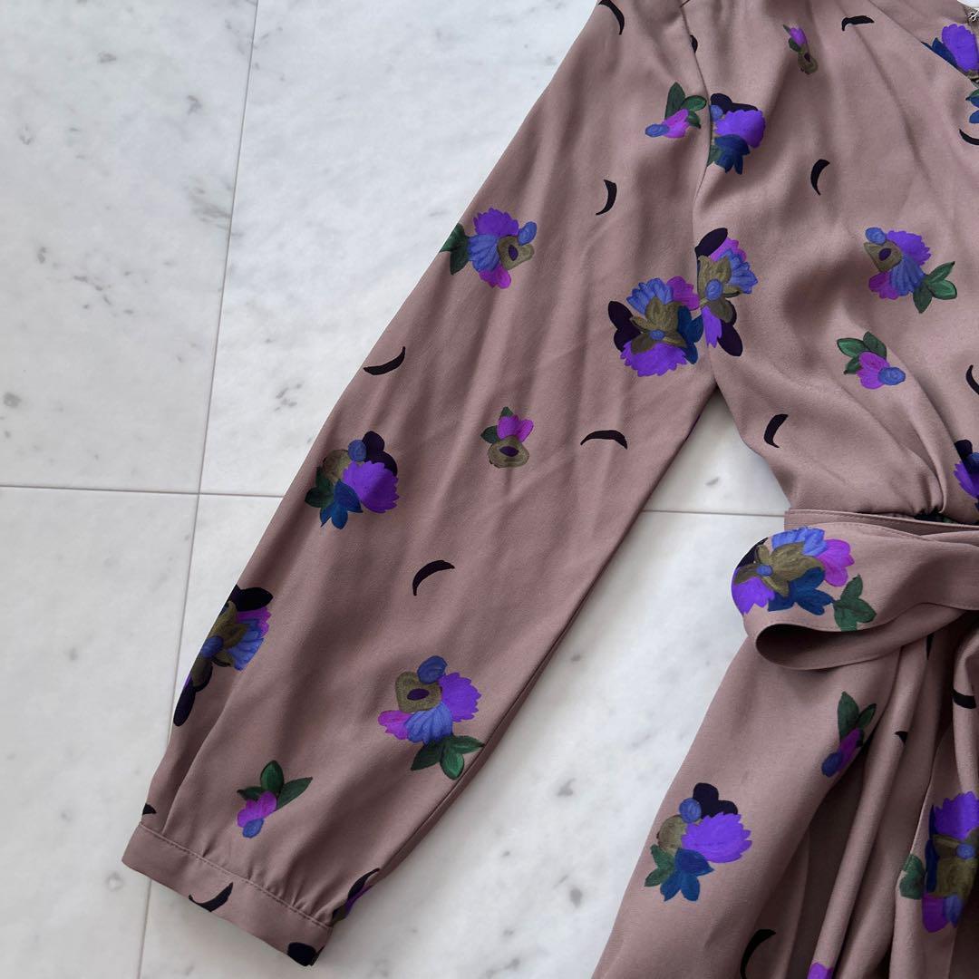 Grace Classらしい、上品なシルエットと華やかな花柄が印象的なワンピースです。さらりとしたトリアセテート混素材で、動くたびに美しいドレープが広がります。落ち着いたベージュベースに紫・青系のフラワープリントが施されており、大人の女性にぴったりの華やかさと品の良さを演出します。共布のウエストリボン付きでメリハリのあるスタイルが叶います。フォーマルシーンやお呼ばれ、女子会やデートなど幅広く活躍する一着です。