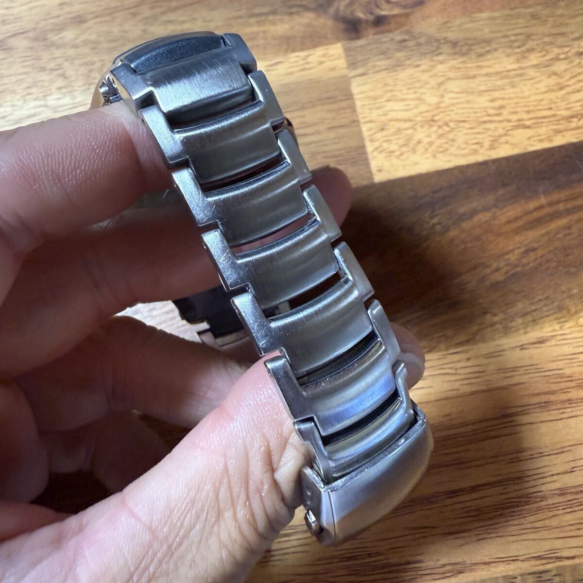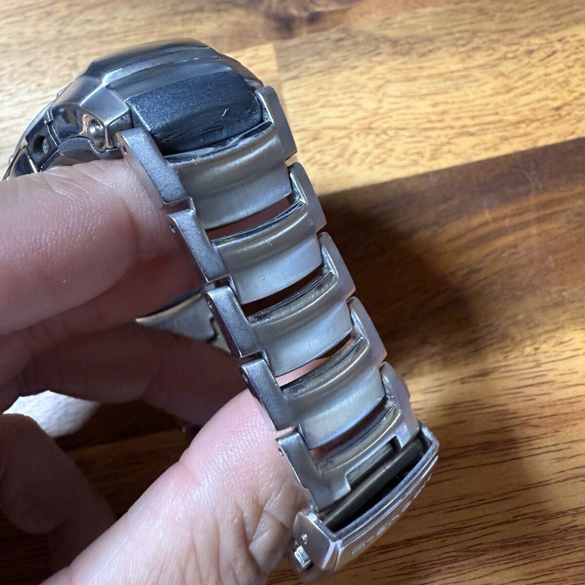 外観ですが大きな傷はありません。軽く磨いたので比較的綺麗です。サイドの操作ボタンはうっすらとした擦り傷があります。ベゼル上部のプラパーツのメッキはほぼ剥がれています。ライトボタンのメッキはきれいに残っています。。ベルト、バックルも薄い線傷はありますが、ざっくりとした深い傷はありません。ステンレスなのでもっと磨き込めば綺麗にすることもできると思います。画像でよく状態を確認してください。